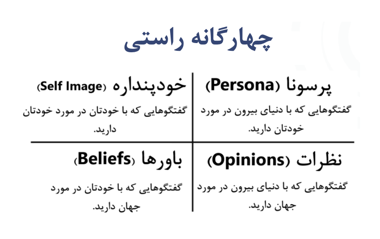 اینجا جایی است که به چارچوب بودش بازمیگردیم، و بهطور خاص به چهارگانه راستی (نمودار چهاربخشی راستی)؛ کورهای که در آن باورهای ما و شیوه ابراز آنها، وضعیت هستیشناختی ما را آشکار میکنند.
